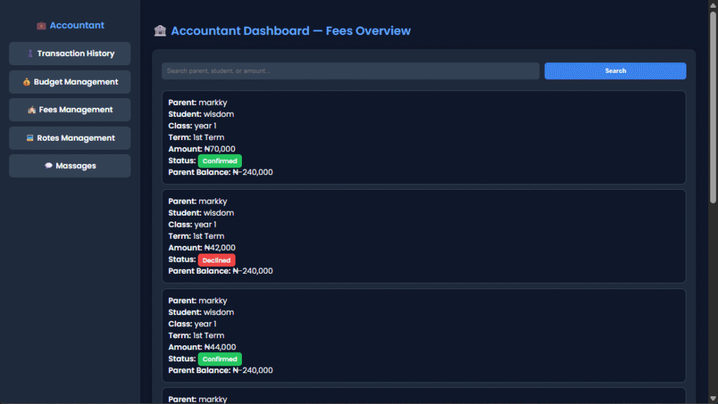 The financial control center of the school. Accountants enjoy powerful tools built specifically for the school finance department: