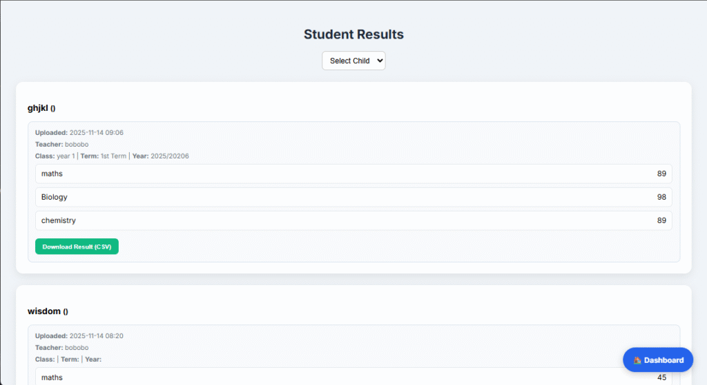 Teachers upload results for each student — whether the student registered personally or the parent registered them.